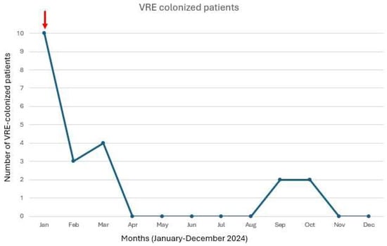 Number of VRE colonized patients over time in the neonatal intensive care unit. The figure shows the monthly number of neonates colonized with vancomycin-resistant Enterococcus in the neonatal intensive care unit during 2024. The red arrow indicates the introduction of polymerase chain reaction (PCR) testing for VRE detection in January 2024.