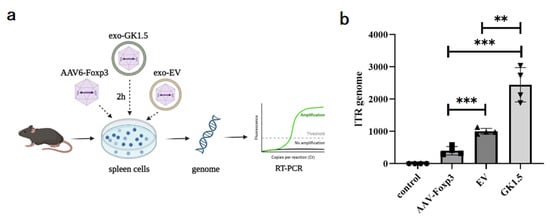 Comparison of exo-AAV binding ability in vitro. (a), After AAV-Foxp3, exo-EV and exo-GK1.5 infected mouse splenocytes in vitro for 2 h, the cell genome was extracted for quantitative PCR detection; (b), relative AAV genome copy number was analyzed with ITR specific primers. **: p < 0.01; ***: p < 0.001.