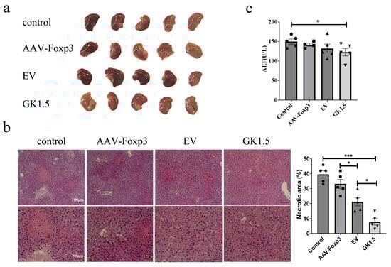 Following AAV intervention in AIH mice, we first assessed changes in liver injury severity. As shown in Figure 4, some liver specimens exhibited signs of congestion or focal necrosis, indicating liver damage. HE staining results revealed that compared to the control group, the exo-GK1.5 group showed a significant reduction in necrotic liver injury (Figure 4b). Additionally, the liver injury severity in the exosome-treated group was significantly lower than that in the AAV-Foxp3 group. Unexpectedly, however, the EV group exhibited more severe hepatic congestion than the untreated group, which may be associated with the inherent effects of exosomes on inflammatory processes. Serum ALT levels were measured in AIH mice, revealing a slight decrease in ALT levels in the AAV-Foxp3, EV, and GK1.5 groups (Figure 4c). Despite the more severe liver congestion observed in the EV group, ALT levels did not show a significant increase, suggesting that the observed liver damage was not strongly correlated with ALT elevation in this case.