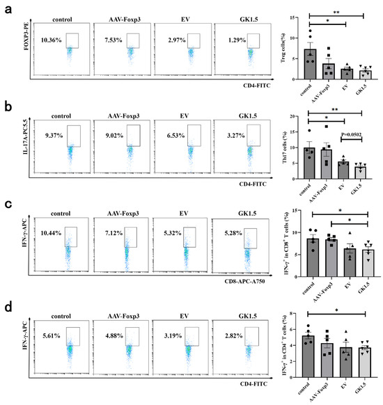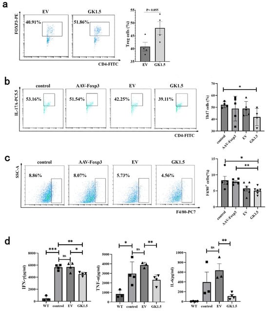 After exo-AAV treatment, the proportion of IHLs of AIH mice were detected. As shown in Figure 5a, the Treg cells in GK1.5 group exhibited an increasing trend compared to the EV group. This result suggests that exo-AAV modified with GK1.5 may have enhanced infection efficiency, leading to an increase in the proportion of Treg cells. Next, we assessed the impact of Treg changes induced by exo-AAV on other AIH-related immune cells. Compared to the control group, the proportion of Th17 cells in the GK1.5 group was significantly reduced (Figure 5b). In contrast, the AAV-Foxp3 and EV treatment groups showed a slight reduction in the proportion of Th17 cells, but this change did not reach statistical significance. Additionally, macrophage-related marker F4/80+ expression in liver cells was assessed. A significant reduction in the proportion of F4/80+ cells was observed in the GK1.5 group compared to the control group (Figure 5c).