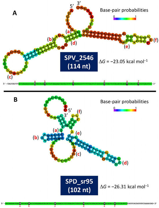 Minimum free energy and secondary structure of the complementary sequence of SPV_2546 (A) and SPD_sr95 (B), as predicted by the RNAfold WebServer (http://rna.tbi.univie.ac.at/cgi-bin/RNAWebSuite/RNAfold.cgi (accessed on 25 March 2025)). The corresponding nucleotide sequences are also shown. Identical sequences are highlighted in green. Letters a to f indicate identical nucleotide positions in both RNA sequences.