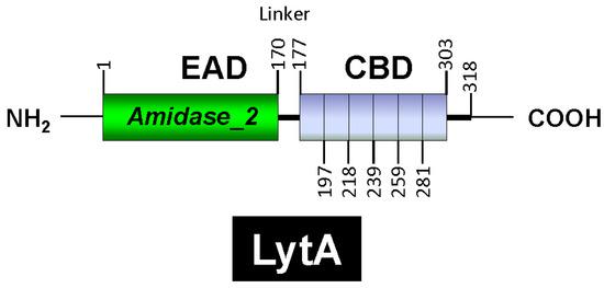 LytA is part of the amidase_2 family of proteins (which possess an Amidase_2 domain, PF01510) [160], including Zn-dependent NAM-amidases and PG recognition proteins (PGRPs), which are highly conserved pattern-recognition molecules of the innate immune system [161]. Notably, several PGRPs (e.g., PGRP-SB1, AgPGRP-S2, AmPGRP-S1, BmPGRP-S5, DmPGRP-LB, RAjPGRP-S, and PGRP-L) also exhibit NAM-amidase activity [162,163,164,165,166]. LytA was the first identified member of the CBP family. Other CBPs, such as the autolysins LytC and CbpD, are also characterized by a choline-binding domain (CBD) responsible for binding to choline residues in WTA and LTA (for reviews, see [153,167,168,169,170,171]). In LytA, the CBD comprises the C-terminal region of the enzyme and consists of six choline-binding repeats (CBRs), each ~20 aa long, and a tail (Figure 4). The C-terminal tail deviates structurally from the other repeats. The N-terminal domain of LytA contains the active center (enzymatically active domain or EAD) (see below). Since the EAD and CBD are found in other proteins, they are often also referred to as “modules” [22].