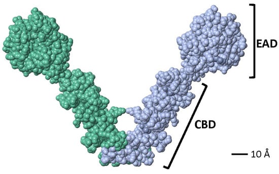 Space-filling model of the active dimer of the LytA NAM-amidase of S. pneumoniae (Accession number 4X36) visualized using FISTGLANCE Version 4.31 in JMOL software (http://www.bioinformatics.org/firstglance/fgij/ (accessed on 5 March 2025)). Monomers are represented in different color. EAD, N-terminal, enzymatically active domain; CBD, C-terminal, choline-binding domain.