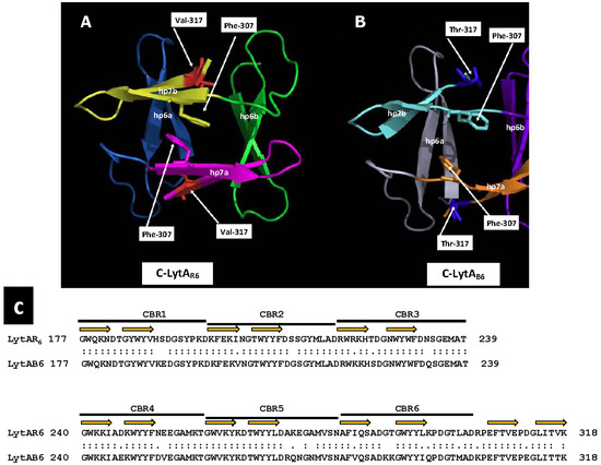 Dimerization interface of C-LytAR6 and C-LytAB6. Ribbon diagrams showing the dimerization interface of the C-termini of LytAR6 (from LytASpn) (A) and C-LytAB6 (from LytAB6, a PPH endolysin) (B). Monomers are labeled a and b. Each hairpin (hp) is colored differently. The side chains of Phe307 and Val/Thr317 are shown. An alignment of the CBD of both enzymes is shown in panel (C). The portions of the sequences that form the first and second strands of the hairpin are indicated by orange arrows.