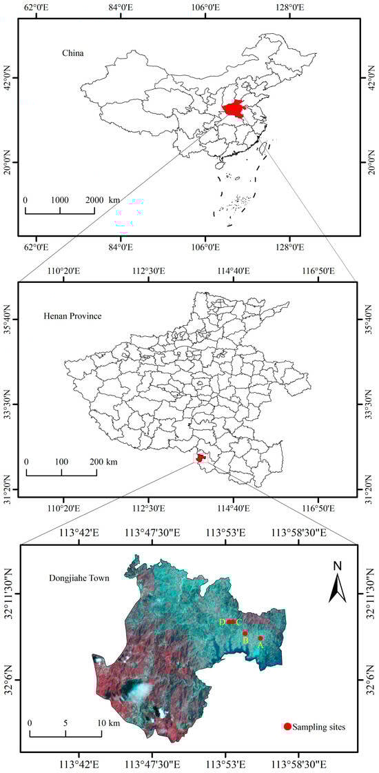 The experimental area is located in the town of Dongjiahe (32°02′21″–32°23′23″ N, 113°45′28″–114°13′09″ E), Shihe District, Xinyang City, Henan Province, China, a primary cultivation zone for Camellia sinensis (Xinyang Maojian tea) (Figure 1). This region lies within the transitional ecotone between the northern subtropical and warm temperate monsoon climate zones, characterized by distinct seasonal variations in temperature and precipitation []. The 2018 meteorological records indicate an annual mean temperature of 16.6 °C, with summer and winter averages of 27.8 °C and 3.4 °C, respectively. The mean annual precipitation is 992 mm, and the relative humidity averages 74.7% (Table S1). The topography comprises eroded hills and low-mountain terrains (elevation: 100–800 m), with dominant yellow–brown soils classified as Haplic Luvisols (FAO taxonomy), with the soil texture classes being light loam and sandy loam, exhibiting a pH range of 4.7–6.5 []. Local tea plantations adhere to a standardized fertilization protocol—basal applications of calcium superphosphate (Ca(H2PO4)2, 375–750 kg·ha−1) and potassium sulfate (K2SO4, 225–375 kg·ha−1) in October–November, followed by nitrogen-focused topdressings of ammonium sulfate ((NH4)2SO4, 37–125 kg·ha−1) in mid-February and post the spring harvest.