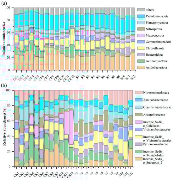 A total of 100,690 high-quality sequences were clustered into 22,668 ASVs. The dominant bacterial taxa (relative abundance ≥ 1%) were taxonomically resolved as shown in Figure 2. At the phylum level (Figure 2a), Acidobacteriota, Pseudomonadota, and Chloroflexota constituted the core microbiota across treatments. S specifically elevated Nitrospirota’s relative abundance compared to the control (CK) (p < 0.05), while other phyla remained statistically invariant (p > 0.05).