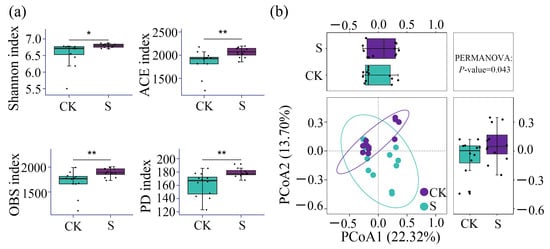 (a) The α-diversity index comparisons of Shannon, the abundance-based coverage estimator metric (ACE), observed OTUs (OBS), and phylogenetic diversity (PD) between different straw treatments (CK and S); (b) The principal coordinate analysis (PCoA) of different straw treatments (CK and S) based on Bray–Curtis distances at the ASV level. CK, a soil sample from the tea plantations without straw application; S, a soil sample from the tea plantations with straw application and permutational multivariate analysis of variance (PERMANOVA). *, significance at the 0.05 level; **, significance at the 0.01 level.