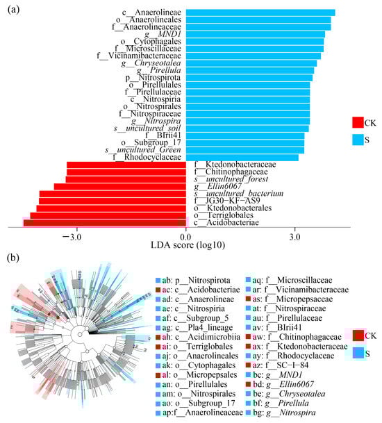 The LEfSe analysis revealed 56 differentially abundant bacterial taxa (LDA > 3.0, p < 0.05), with 40 S-enriched and 16 CK-enriched taxa (Table S5). The top 30 discriminative taxa spanned 8 phyla, where Acidobacteriae (LDA = −4.47) in CK and Anaerolineae (LDA = 4.11) in S emerged as the primary biomarkers (Figure 4a). The phylum-level analysis confirmed Nitrospirota as the differential bacterial taxa (p < 0.05). The genus-level analysis demonstrated treatment-specific patterns—the uncultured genus Ellin6067 (LDA = −3.63) dominated CK soils (p < 0.05), while Chryseotalea (LDA = 3.60), Pirellula (LDA = 3.53), Nitrospira (LDA = 3.41), and MND1 (LDA = 3.82) were significantly enriched in S (p < 0.05).