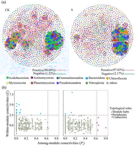 (a) The soil bacterial co-occurrence network analysis of CK and S (a); (b) the within-/among-module connectivity results of the soil bacterial co-occurrence network in CK and S. CK, a soil sample from the tea plantations without straw application; S, a soil sample from the tea plantations with straw application.