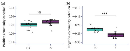 The bacterial community cohesion was analyzed to reveal the nuanced patterns of the microbial network between CK and S. Though positive community cohesion (Figure 6a) showed no significant difference between CK (0.250) and S (0.264) (p > 0.05), the negative cohesion (Figure 6b) exhibited an extremely marked divergence by 13.9% (p < 0.001) (Figure 6). This suggests that S treatment selectively intensified competitive microbial interactions without significantly altering cooperative networks.