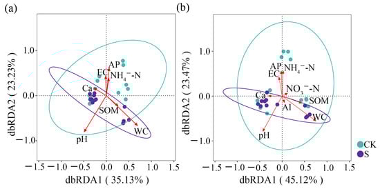 (a) The distance-based redundancy analysis (dbRDA) plots of bacterial β-diversity with the soil physicochemical properties; (b) the dbRDA plots of the keystone taxa with the soil physicochemical properties. CK, a soil sample from the tea plantations without straw application; S, a soil sample from the tea plantations with straw application.