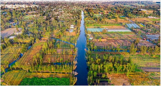 - Pérez-Belmont, P.; Lerner, A.M.; Mazari-Hiriart, M.; Valiente, E. The survival of agriculture on the edge: Perceptions of push and pull factors for the persistence of the ancient chinampas of Xochimilco, Mexico City. J. Rural Stud. 2021, 86, 452–462. [Google Scholar] [CrossRef]