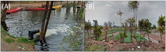Images of Lake Xochimilco. (A) Effluent waters filling Xochimilco Lake. (B) Chinampa on the Lake. Images were obtained from Google Maps at coordinates (19.2606387, −99.0748693) and (19.2650673, −99.0733166).