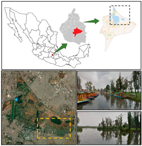 Despite being a highly productive agricultural system, Lake Xochimilco faces numerous threats, including intensive farming practices, pesticide usage, pest infestations, soil erosion, the introduction of non-native species (both aquatic and terrestrial), regional climate changes, forest degradation, flooding, land subsidence, irregular human settlements, and rapid urbanization that contribute to soil and water contamination [,,]. Additionally, the 187 km of canals are now maintained using water from a treatment plant (Figure 2), which is utilized for irrigating crops in the Chinampas region.