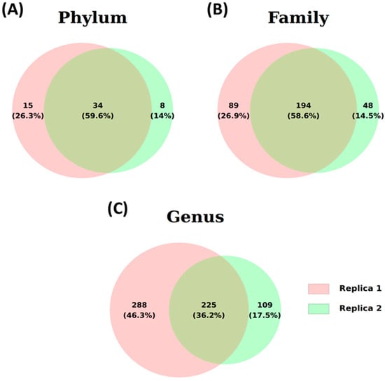 Illustrative Venn diagram of identified ASVs for two water samples (Samples 1 and 2) at the three taxonomic levels: (A) phylum, (B) family, and (C) genus.