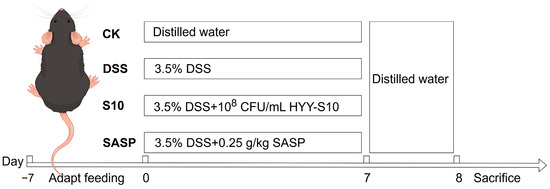 C57BL/6J SPF-grade male mice, aged five weeks, were obtained from Guangdong Viton Lihua Laboratory Animal Technology Co., Ltd. (Foshan City, China). The mice were acclimated to a 25 ± 0.5 °C light–dark cycle for seven days upon arrival. Subsequently, the mice were randomly assigned to four groups, each consisting of eight individuals. Both dextran sodium sulfate (DSS, CAS 9011-18-1, MW 40,000; Shanghai Aladdin Biochemical Technology Co., Ltd., Shanghai, China) and sulfasalazine (Shanghai Xinyi Tianping Pharmaceutical Co., Ltd., Shanghai, China) were dissolved in sterile water and filtered through a 0.22 μm membrane for sterilization. HYY-S10 solution was used and was prepared using sterile water to formulate a suspension of 1 × 108 CFU/mL. The experimental protocol is depicted in Figure 1 The CK was orally administered sterile distilled water for seven days to establish a baseline. In contrast, the DSS group received a 3.5% (w/v) DSS solution orally for seven days to induce colitis. The S10 group was co-administered 0.2 mL/10 g of HYY-S10 (108 CFU/mL) and the 3.5% (w/v) DSS solution daily for seven days. Meanwhile, the SASP group was treated with 0.25 g/kg sulfasalazine pyridine solution in combination with the DSS solution for the same duration.