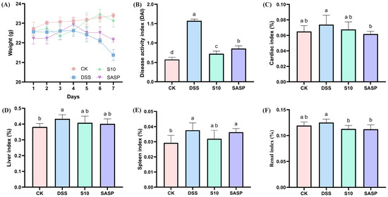 Therapeutic evaluation of Lactiplantibacillus plantarum HYY-S10 (HYY-S10) in mice with colitis. (A) Rate of change in body weight of mice; (B) DAI index; (C) Cardiac index; (D) Hepatic index; (E) Splenic index; and (F) Renal index. The letters a,b,c,d indicated significant difference between different groups (p < 0.05).