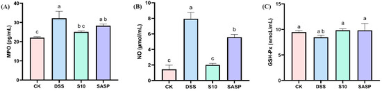 Effect of Lactiplantibacillus plantarum HYY-S10 on antioxidant factors in serum of colitis mice. (A) MPO; (B) NO; (C) GSH-Px. The letters a,b,c indicated significant difference between different groups (p < 0.05).