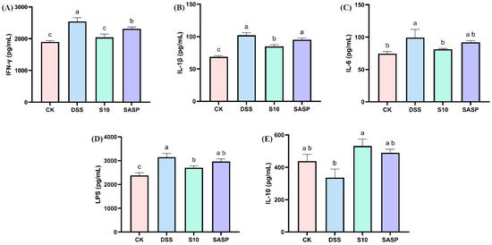 Effect of Lactiplantibacillus plantarum HYY-S10 on inflammatory factors in serum of mice with colitis. (A) IFN-γ; (B) IL-1β; (C) IL-6; (D) LPS; (E) IL-10. The letters a,b,c indicated significant difference between different groups (p < 0.05).