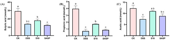 As shown in Figure 6, the levels of various SCFAs in the feces of DSS mice showed a decreasing trend, which may be related to the disruption of gut flora diversity by DSS. Compared with DSS-induced mice, HYY-S10 increased the levels of butyric acid (Figure 6A), propionic acid (Figure 6B) and acetic acid (Figure 6C) in mouse feces, suggesting that HYY-S10 was able to improve intestinal function by regulating the diversity of intestinal flora.
