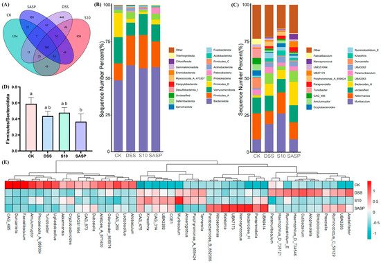 16S rRNA sequencing analysis revealed distinct operational taxonomic unit (OTU) distributions among the experimental groups, as shown in the Venn diagrams (Figure 7A). The CK group showed the highest diversity with 1254 unique OTUs, followed by the S10 group (608 OTUs), SASP group (593 OTUs), and DSS group (440 OTUs). Intersection analysis revealed that the S10 group shared the highest number of OTUs (277) with the CK group, while the DSS group showed the least overlap (202 OTUs). A core microbiome of 160 OTUs was conserved across all groups. Comparative analysis revealed a significant reduction of 772 OTUs in the DSS group compared to the CK group. Notably, the HYY-S10 intervention resulted in significant microbial restoration, as evidenced by an increase of 230 OTUs compared to the DSS group. In addition, the results suggest that colitis leads to a decrease in the diversity of the gut flora in mice and that administration of HYY-S10 has the potential to increase the complexity of the gut microbiota.