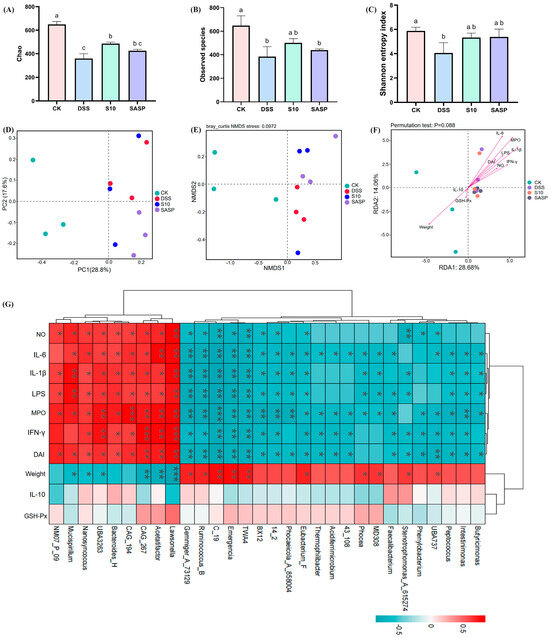 To gain a more in-depth understanding of the association between gut microbiota and colitis, we conducted a correlation analysis focusing on the top 30 genera. As illustrated in Figure 8G, this analysis used red to denote positive correlations and blue to represent negative correlations. This color-coded visualization facilitates clear discernment of the relationships between these genera and colitis. The levels of IL-1β, IL-6, IFN-γ, LPS, NO, MPO, and DAI showed positive correlated with Lawsonella, Acetatifactor, CAG_267, CAG_194, Bacteroides_H, UBA3263, and Nanosyncoccus (p < 0.05). In contrast, a negative correlation was observed (p < 0.05) with Eubacterium_F, 14_2, BX12, TWA4, Emergencia, C_19, Ruminococcus_B, Gemmiger_73129. Weight was positively correlated with UBA737, Stenotrophomonas_A_615274, MD308, Phocea, Eubacterium_F, TWA4, Emergencia, C_19, Ruminococcus_B, and Gemmiger_73129; and weight was negatively correlated with Lawsonella, Acetatifactor, UBA3263, Nanosyncoccus, and Mucispirillum. Among these, Ruminococcus_B is one of the most important gut microbiota genera for relieving colitis symptoms by fermenting dietary fiber to produce secondary metabolites (butyric acid and propionic acid) [22]. The correlation between IL-10, GSH-Px, and intestinal flora was not significant (p > 0.05). RDA analysis indicated a positive correlation between the levels of IFN-γ, IL-6, IL-1β, LPS, MPO, NO, and DAI with the intestinal flora present in the DSS, S10, and SASP groups (p < 0.05), arranged as follows: MPO > IL-6 > IL-1β > LPS > IFN-γ > DAI > NO. In the CK group, weight, IL-10, and GSH-Px showed a positive correlation with the intestinal flora, with weight displaying the strongest association (Figure 8F).
