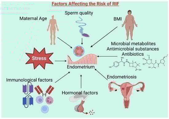 Factors contributing to recurrent implantation failure (RIF). Multiple factors are associated with RIF, including maternal age, body mass index (BMI), microbial metabolites, endometriosis, hormonal and immunological factors, stress, and sperm quality. These elements can influence embryo–endometrium cross-talk and implantation outcomes. (Created with BioRender).