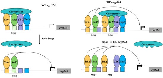 A diagram of potential roles of trans- and cis-acting factors at wild-type and TR34 cyp51A promoters. A hypothetical corepressor is pictured that makes multivalent contacts with the key regulators of cyp51A transcription. The proximal ATRE is indicated by a green hatched box. Other binding sites are color-coded with their respective regulators. Azole drugs trigger corepressor dissociation and gene activation. In the case of the TR34 promoter (right-hand diagrams), the distal SRE and ATRE in the upstream 34 bp repeat can bypass corepressor function and activate transcription. The 34 bp tandem repeats do not include the HXRE but maintain a CBC binding site. Interaction of the CBC with the adjacent HXRE is required for strong binding of these factors. Exposure of the TR34 cyp51A gene to azole drugs or loss of the pSRE or pATRE (shown here) triggers strong induction of expression. Adapted from Figure 2C in reference [42].