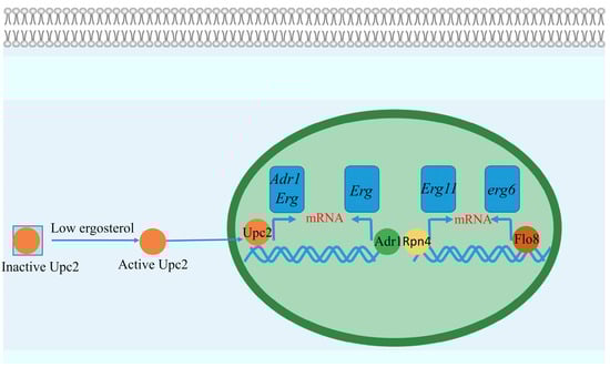 The transcription factors involved in ergosterol biosynthesis in Candida Species. The Upc2 transcription factor binds to ergosterol and remains inactive in the cytosol. Depletion of ergosterol changes Upc2 to an active form, which enters the nucleus and initiates the transcription of the genes for ergosterol biosynthesis. In C. albicans, activated Upc2 also triggers expression of the Adr1 transcription factor, which further leads to direct expression of ergosterol biosynthesis genes.