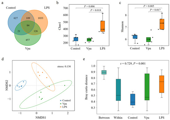 (a) Venn analysis results of bacterial ASV numbers in the Penaeus vannamei intestine of the control, Vpa, and LPS groups. (b,c) Comparative analysis of the Chao1 and Shannon indices in the bacterial community within P. vannamei intestines among the control, Vpa, and LPS groups. (d,e) NMDS and PERMANOVA results of community structure within the P. vannamei intestines among the control, Vpa, and LPS groups. Vpa: Vibrio parahaemolyticus; LPS: lipopolysaccharide.