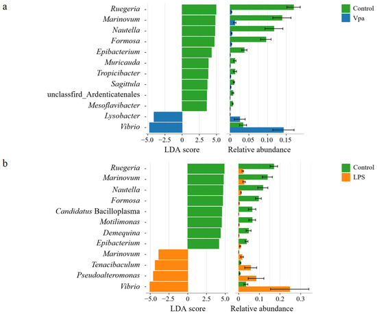 (a) LEfSe results of bacterial indicator genera within the P. vannamei intestines in the control and Vpa groups. (b) LEfSe results of bacterial indicator genera between the control and LPS groups. Vpa: Vibrio parahaemolyticus; LPS: lipopolysaccharide.