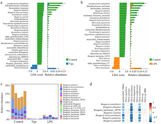 (a) LEfSe results of the bacterial indicator species within P. vannamei intestines in the control and Vpa LPS groups and (b) between the control and LPS groups. (c) Relative abundances of Ruegeria species within the P. vannamei intestines in the control, Vpa, and LPS groups. (d) Spearman’s correlation analysis was utilized to examine the relationships between Ruegeria species and Vibrio species; * means p < 0.05. Vpa: Vibrio parahaemolyticus; LPS: lipopolysaccharide.