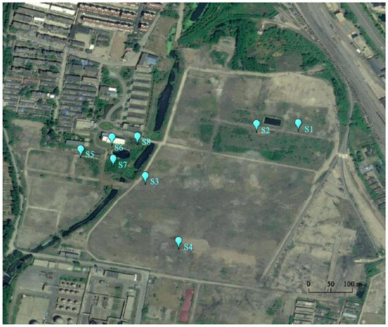 Our study investigated an old, abandoned coking plant in eastern China (Figure 1). To meet the needs of urbanization and development, the coking plant ceased production in 2015, and most of the production equipment in the plant has been dismantled. Soil samples were collected following HJ/T166-2004 [7] We collected four soil samples at the coking production area (CA, S1–S4) and four soil samples at the office area (OA, S6–S8) of the site in the winter of 2022. Each sample was a mixture of five soil cores (0–15 cm) from a 1 × 1 m2 area at the sampling point. The soil samples were collected in sterile bottles insulated with dry ice and sent to the laboratory to be stored at −80 °C for microbiological and soil chemical analysis.