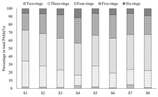 The highest content of total PAHs was found in S3 (554.05 mg/kg), and the lowest was in S7 (3.27 mg/kg) (Supplementary Materials, Table S1). We used the Mann–Whitney test to analyze the PAHs in two areas (coking production area and office area), the result showed that there was a significant difference (p < 0.05) between the two areas (Supplementary Materials, Table S2). Additionally, the PAHs in all the samples were dominated by high molecular weight (HMW) PAHs, accounting for 65.72% to 83.86% of the total (Figure 2).