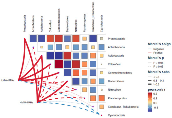 Both LMW-PAHs and HMW-PAHs were significantly positively correlated with Proteobacteria and Aciddobacteria (p < 0.05) (Figure 3). Furthermore, Proteobacteria showed a positive correlation with Chloroflexi and Gemmatimonadetes (p < 0.05). Principal coordinates analysis (PCoA) of the soil communities revealed that the similarities between the phylum types of CA and OA were significantly different (Supplementary Materials, Figure S1). The findings reveal the existence of characteristic microorganisms that have adapted to this stressful environment in PAH-contaminated soil, and the results of the study indicate the characteristics of these microbial phyla in the biodegradation of soil PAHs.