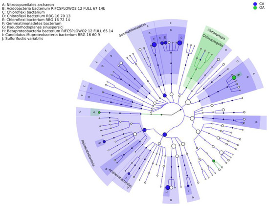 There were significant differences between the CA and OA groups at the species level (p < 0.05) (Supplementary Materials, Figure S2). Lefse analysis identified significantly different species markers in the CA group (Figure 4), primarily comprising of the following: Chloroflexi bacterium RGB 16070013/167214, Gemmatimonadetes bacterium, Betaprobacteria bacterium rifcsplowo2 12 full 6514, candidatus Muproteobacteria bacterium RBG16609, and Sulfurifustis variabilis. These findings are consistent with the results of our study.