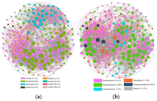 Co-occurrence networks of microbial communities. (a) Different modularity classes; (b) node colors indicate different phyla. The red line means positive correlation and the green line means negative correlation.