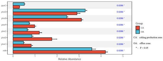 Meanwhile, the relative abundance of phnP, phnE, phnC, and phnD genes, which belong to the phn gene cluster, in CA was significantly higher (p < 0.05). The phn gene cluster comprises a group of tightly spaced genes that are relatively centralized on the chromosome, and collectively encode the enzymes and auxiliary proteins involved in the degradation of aromatic compounds [15]. It has been reported that the phn genes of the burkholderia cepacia RP007 strain constitute a cluster of genes involved in the catabolism and metabolism of polycyclic aromatic hydrocarbons. These genes are transcribed and the recombinant phn enzyme is able to oxidatively metabolize naphthalene and phenanthrene when the RP007 strain needs to consume them in its growth process [16]. Researchers have identified the genes for the entire catabolic pathway of phenanthrene through the phylogeny of the cyclic hydroxylated dioxygenase (RHD) that initiates bacterial PAH metabolism on a new genomic island (GEI) approximately 232 kb long, referred to as the phn island [17]. The presence or absence of the phn gene and the level of its expression can also be used as an indicator of an environmental pollutant’s degradation capacity. By detecting the expression of the phn gene in a specific environment, the degradation capacity of the environment for PAHs and chlorinated aromatic compounds can be assessed, providing a scientific basis for environmental monitoring and assessment.