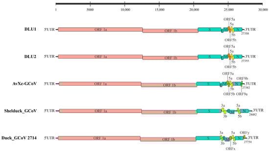 Genome structures of five GCoVs. Red represents ORF1a/b, green represents structural proteins, yellow represents accessory proteins, and orange represents putative proteins. The GenBank accession numbers corresponding to AvXc-GCoV, Shelduck_GCoV, and Duck_GCoV 2714 are PP845453, MK204411, and NC_048214, respectively.