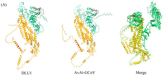 Among the structural proteins, the gene encoding the S protein is the most prone to mutations in CoVs. The S protein of BHG-GCoVs consists of 1,123 aa and has a unique S1/S2 cleavage site (520-FTPEKQVLDIKRFTSNYTEYAPMVFSD-546) [30], forming two subunits, S1 (546 aa) and S2 (577 aa). Similarity analysis of the S protein showed that the aa similarity between BHG-GCoVs and the GCoV of ruddy turnstone (Arenaria interpres) (AvAi-GCoV) ranges from 96.26% to 96.44%. In the S1 subunit, there are 37 aa differences between BHG-GCoVs and AvAi-GCoV, resulting in a similarity of 93.22%. In the S2 subunit, there are only 2 aa differences, yielding a similarity of 99.65%. The tertiary structure of the S protein of DLU1 and AvAi-GCoV is shown in Figure 3A. Interestingly, the aa similarity of the S protein of BHG-GCoVs varies from 88.69% to 96.44% with that of GCoVs from Charadriiformes (AvXc-GCoV, AvNp-GCoV, AvAi-GCoV, AvCt-GCoV, AvCa-GCoV, AvTt-GCoV, AvLl-GCoV, excluding the common gull GCoV). In contrast, the similarity with GCoVs from Anseriformes (AvAc-GCoV, AvAa-GCoV, AvAp-GCoV, AvAz-GCoV, AvMp-GCoV, AvMs-GCoV, Shelduck_CoV, Duck_GCoV 2714) is significantly lower, ranging from 31.15% to 54.81%. It is noteworthy that although both the common gull and the black-headed gull belong to the family Laridae, the aa similarity of the S protein of their GCoVs is only 54.51% to 54.59% (Supplementary Table S2).