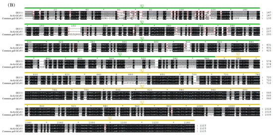 (A) Tertiary structure of the S protein of DLU1 and AvAi-GCoV. Green represents the S1 subunit, yellow represents the S2 subunit, and red represents the amino acid differences in the S proteins of DLU1 and AvAi-GCoV. (B) Multiple alignment of the amino acids of the S protein of DLU1, AvAi-GCoV, and common gull GCoV. The red box represents the amino acid differences between DLU1 and AvAi-GCoV. There is an interval of 20 nucleotides between two adjacent “*”.