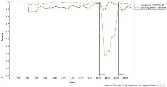 We found that two strains of BHG-GCoVs changed their positions in the phylogenetic trees based on different domains, indicating that recombination events may occur frequently during virus evolution. Screening for potential recombination events was conducted on the whole-genome sequences of the two BHG-GCoVs in this study. The most significant recombination events in DLU1 and DLU2 were identified using the GENECONV (p-value: 8.66 × 10−243) and RDP (p-value: 2.035 × 10−251) methods provided by the RDP v4.100 program. These recombination events, characterized by strong p-values, were further confirmed using the SimPlot v3.5.1 program. The results indicated that BHG-GCoVs are likely recombinant strains derived from common gull GCoV and AvAi-GCoV, with breakpoints at genomic positions 20,156 bp and 24,432 bp located near the start and end regions of the S protein (Figure 6).