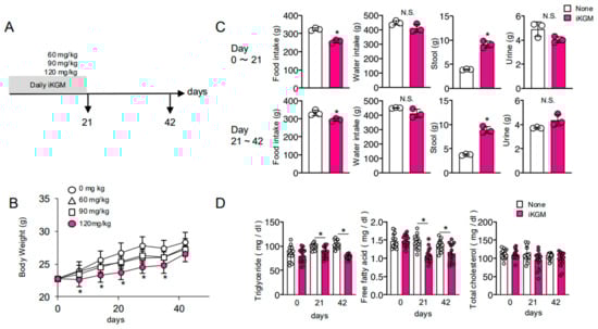 Eight-week-old female C57BL/6J mice, procured from Japan SLC (Hamamatsu, Japan), were housed under specific pathogen-free conditions. Experiments were conducted when the mice reached 10 to 12 weeks of age. The study was reviewed and authorized by the Animal Ethics Committee of the Graduate School of Gunma University (approval number 16-041; approval date: 20 September 2016) and was performed in compliance with the institutional guidelines for animal experimentation, as well as Japanese government regulations (law No. 105 and notification No. 6). The mice were randomly assigned to either a control group or an iKGM-treated group. The iKGM was orally administered at a dosage of 120 mg/kg/day, which corresponds to a human equivalent of 7.2 g/day for a 60 kg individual. The mean initial body weight of the mice was 22.5 g, and the daily dose per mouse was calculated as follows: 120 mg/kg × 0.025 kg = 2.7 mg. Throughout the experiment, food and water consumption were monitored, and fecal and urinary output was measured. Serum, intestinal contents, and tissue samples were periodically collected for analysis. The feed efficiency ratio (FER) was computed as weight gain (g) per gram of food intake, while the feed conversion ratio (FCR) was defined as food consumption (g) per gram of body weight gain.
