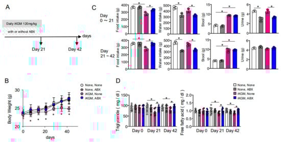 Abrogation of weight suppressing effects of iKGM by antibiotic treatment. Mice fed with 120 mg/kg iKGM were simultaneously treated with antibiotics cocktail (ABX) (A). Body weight of these mice were monitored weekly for 6 weeks. The values are mean ± SD from five mice per group. The results of one representative experiment among three repeated experiments with similar results are shown (B). Food/water input and fecal/urinal output were monitored as in Figure 1C (C). Triglyceride and free fatty acid were measured. Each dot represents result of an individual mouse (5 mice/experiment) in two experiments, and bar graphs show mean ± SD from 10 mice (D). Asterisks denotes statistical significance: * p < 0.05 as determined by the unpaired two-tailed Student’s t-test.