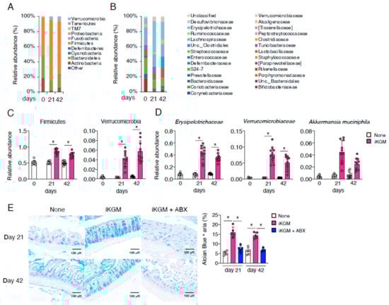 Alteration of intestinal microbiota in mice fed with iKGM. Comprehensive analyses of intestinal microbiota were performed based on 16S rRNA pyrosequencing. Relative abundance of fecal bacterial phyla (A), genera (B), Firmicutes and Verrucomicrobia (C), Erysipelotrichaceae, Verrucomicrobia, and Akkermansia muciniphila (D) in mice before, 21 days after, and 42 days after iKGM feeding are shown. Values in (A,B) are mean of 10 mice. In (C,D), each dot represents results of 10 individual mice, and bar graphs show mean ± SD from 10 mice. Tissues of small intestines from iKGM-treated mice on day 21 and 42 were examined to visualize mucin-producing cells by staining Alcian blue dye. Alcian blue-stained areas were digitally quantified, and each dot represents results of individual five mice and bar graphs show mean ± SD from five mice (E). Asterisks denote statistical significance: * p < 0.05 as determined by the unpaired two-tailed Student’s t-test.