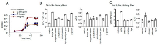 Ability of iKGM to increase A. muciniphila. A. muciniphila was cultured with the indicated concentration of iKGM, and turbidity of culture medium was periodically measured (A). Then, A. muciniphila was cultured with soluble (B) and insoluble dietary fibers (C) at concentration of 1 mg/mL. Turbidity of culture medium and bacterial number was determined, and each dot represents results from one independent experiment and bar graphs show mean ± SD of three repeated experiments.