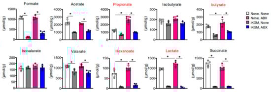 Impact of iKGM treatment on intestinal metabolites. Several metabolites, specifically, water-soluble acids including SCFA in intestinal contents obtained from mice 21 days after iKGM treatment were quantified. Each dot represents a result from an individual mouse, and bar graphs show the mean ± SD of five mice. The results of one representative experiment among two repeated experiments with similar results are shown. Compounds shown in red are significantly changed after iKGM administration. Asterisks denote statistical significance: * p < 0.05 as determined by the unpaired two-tailed Student’s t-test.
