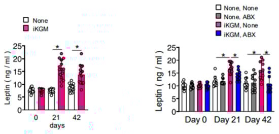 Increased serum leptin concentration in mice treated with iKGM dependent on intestinal microbiota. Serum samples obtained from the indicated mice were used for leptin quantification. Each dot represents a result from an individual 10 mice, and bar graphs show mean ± SD of 10 mice. The results of one representative experiment among two repeated experiments with similar results are shown. Asterisks denote statistical significance: * p < 0.05 as determined by the unpaired two-tailed Student’s t-test.