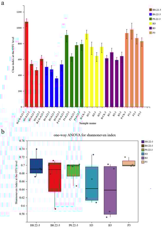 To gain insights into the α-diversity of different cultivation models, Chao and Shannon index analyses were conducted at the OTU level. The Chao and Shannon index plots at the OTU level showed a consistent trend between the two methods (Figure 1). For the samples with particle sizes ranging from 0.22 to 3 μm, the highest index was observed in the pond aquafarm samples (P), while the lowest index was found in the biofloc technology aquafarm (B) (Figure 1). This indicated that the pond aquafarm samples exhibited the highest α-diversity, whereas the biofloc technology aquafarm samples exhibited the lowest α-diversity. Similarly, for samples with particle sizes greater than 3 μm, the highest indexes were also observed in the pond aquafarm samples (as indicated by both Chao and Shannon indexes), and the lowest indexes were found in the biofloc technology aquafarm samples (B) (Figure 1). This further suggests that the pond aquafarm samples have the highest α-diversity, while the biofloc technology aquafarm samples have the lowest α-diversity for this particle size.