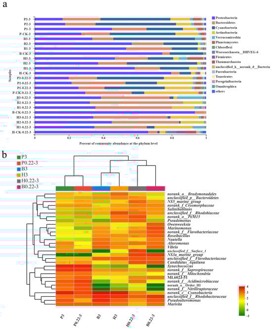 (a) Phylum-level dominant bacteria distribution of different seawater samples from the three aquaculture modes. (b) Genus-level heatmap analysis of different seawater samples of the different aquaculture modes.